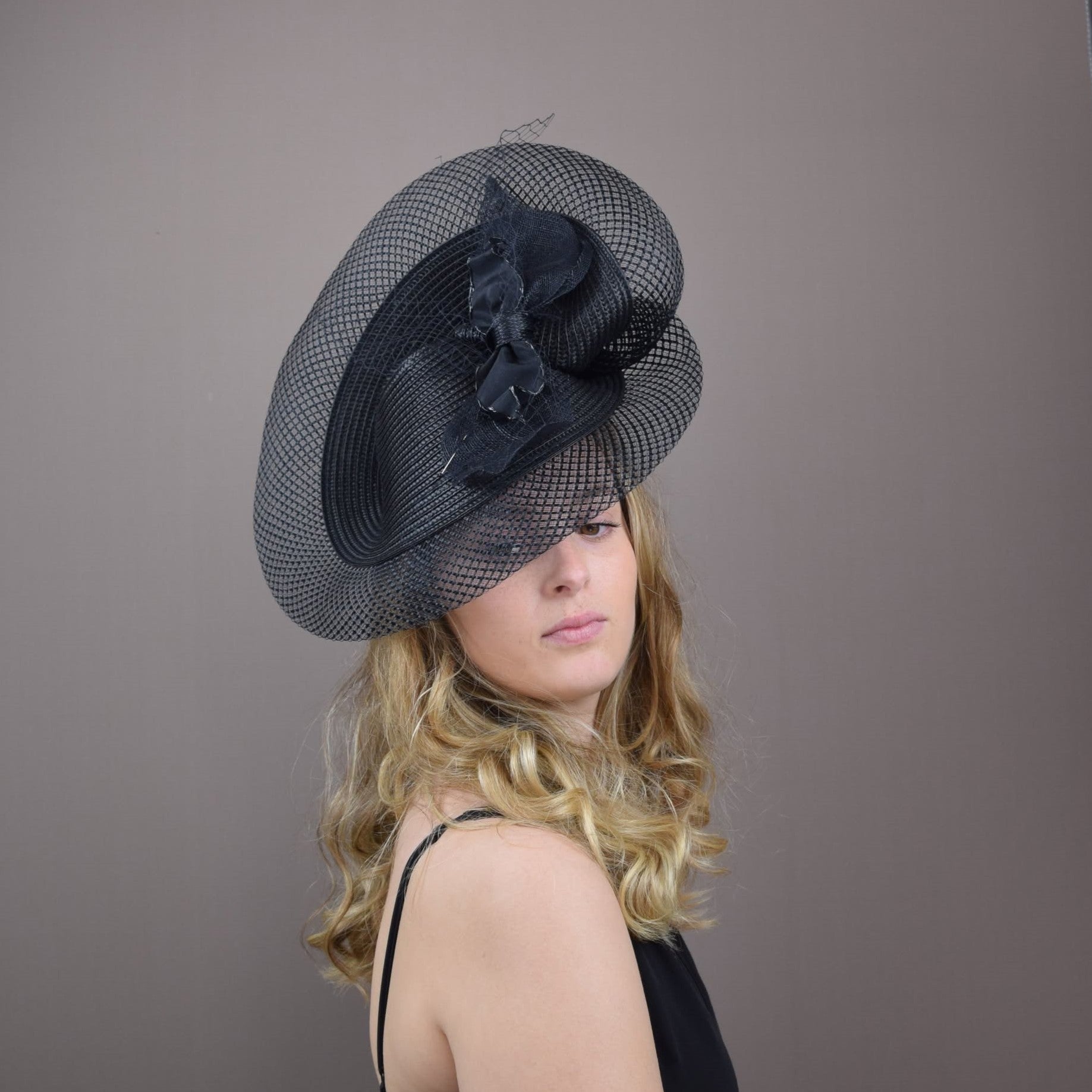 Hand sculpted straw edged with a translucent checkered mesh, this headpiece is designed to be worn on the right hand side of the head low over the face.
