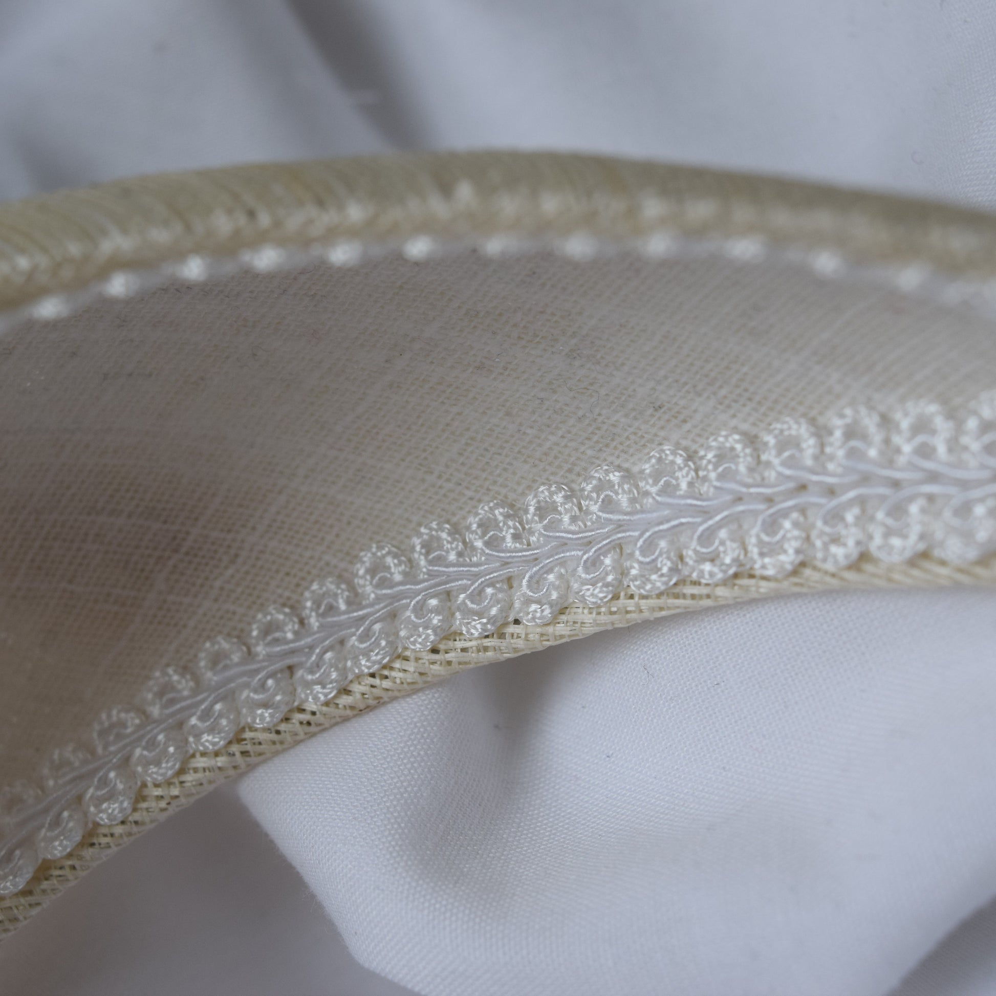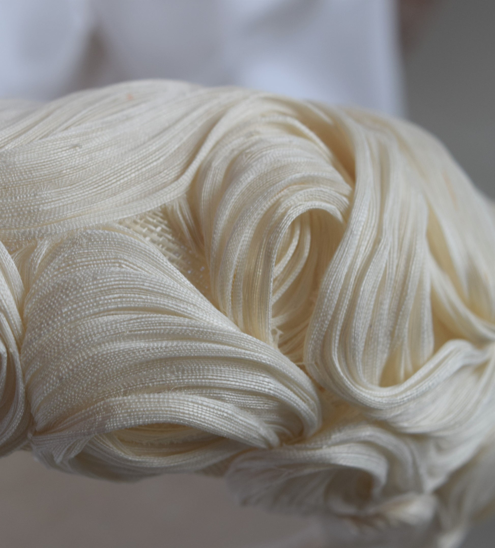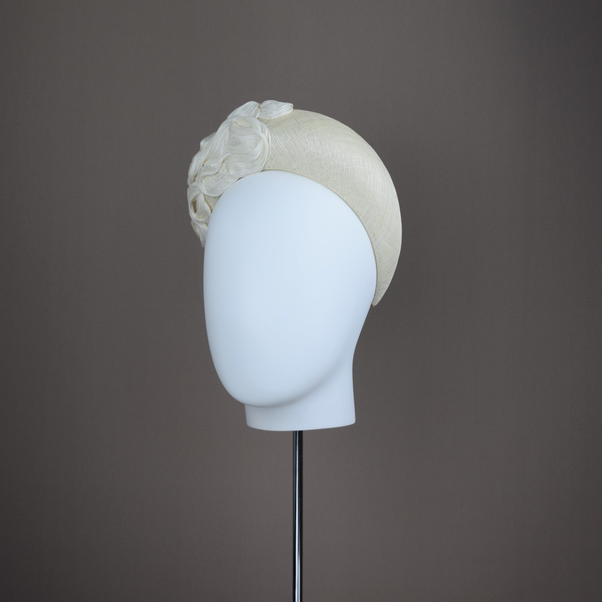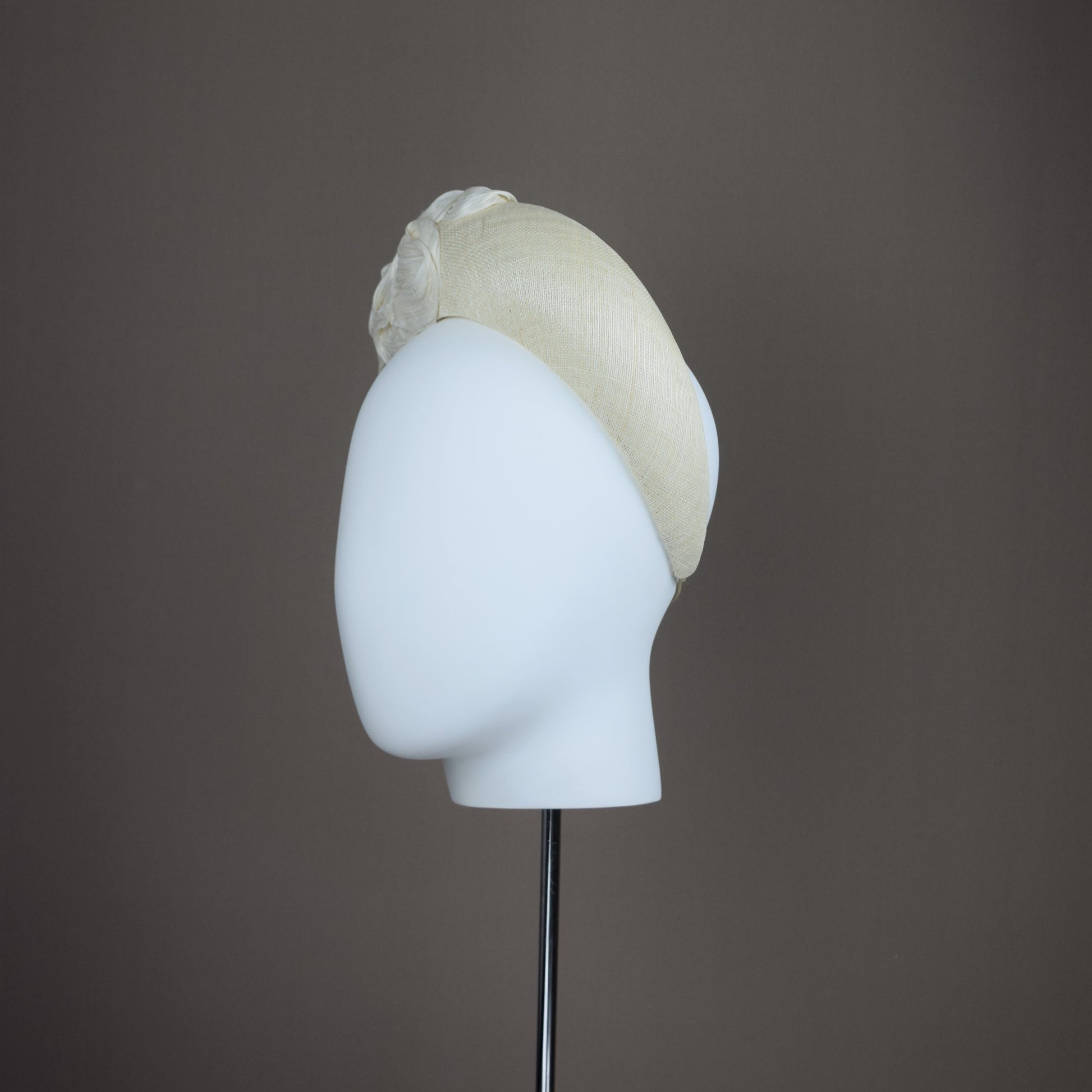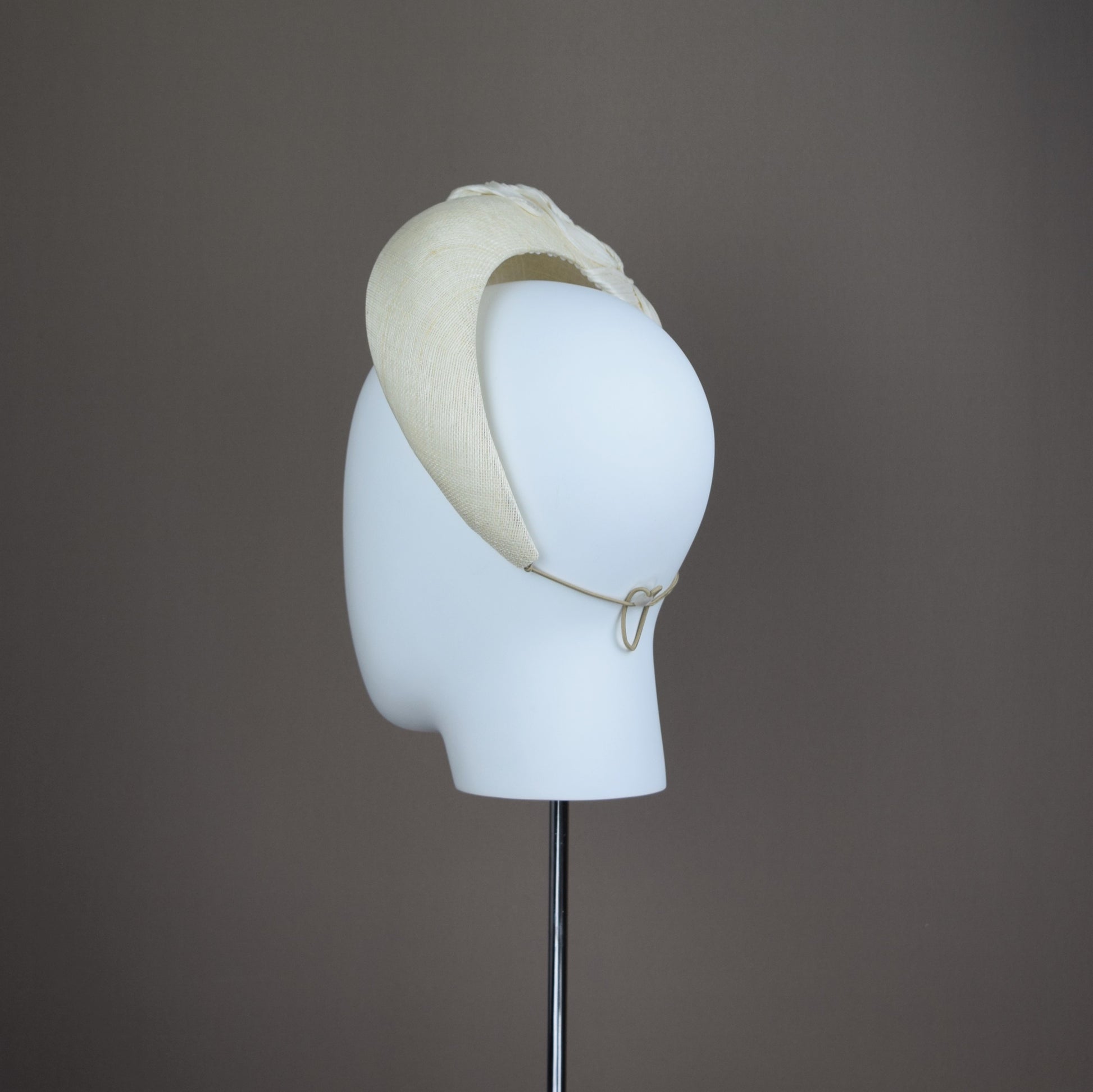 Formed from the finest quality sinamay straw in a rich ivory/cream shade and embellished with swirls of sculptural silk abaca. Because our headbands are made individually by hand  there will be slight variations in each design.