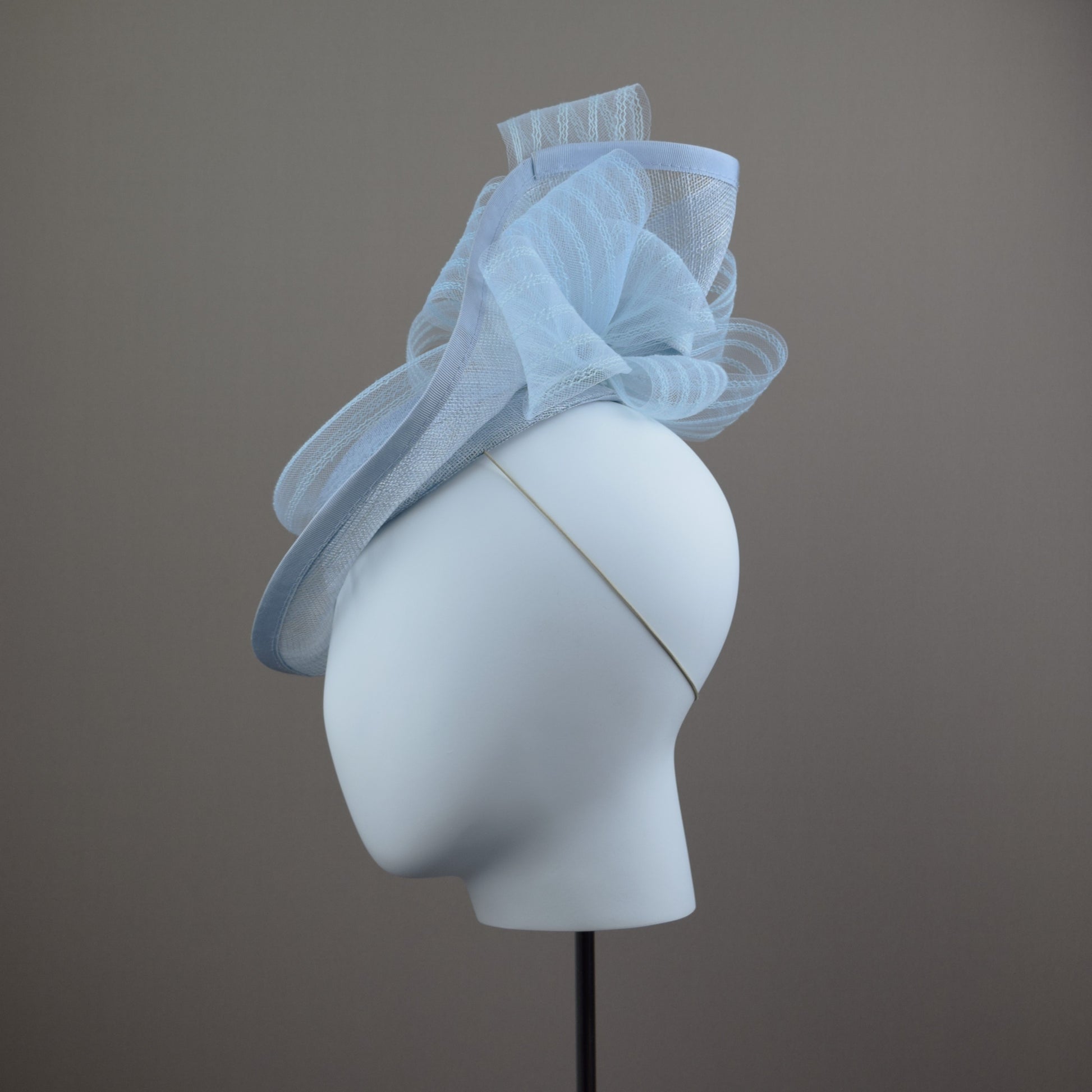 A unique one of a kind piece hand blocked and wired using traditional millinery skills. This lovely hat is formed from light blue sinamay straw. Loops of fine embroidered mesh ribbon adorn this unique, one of a kind design.