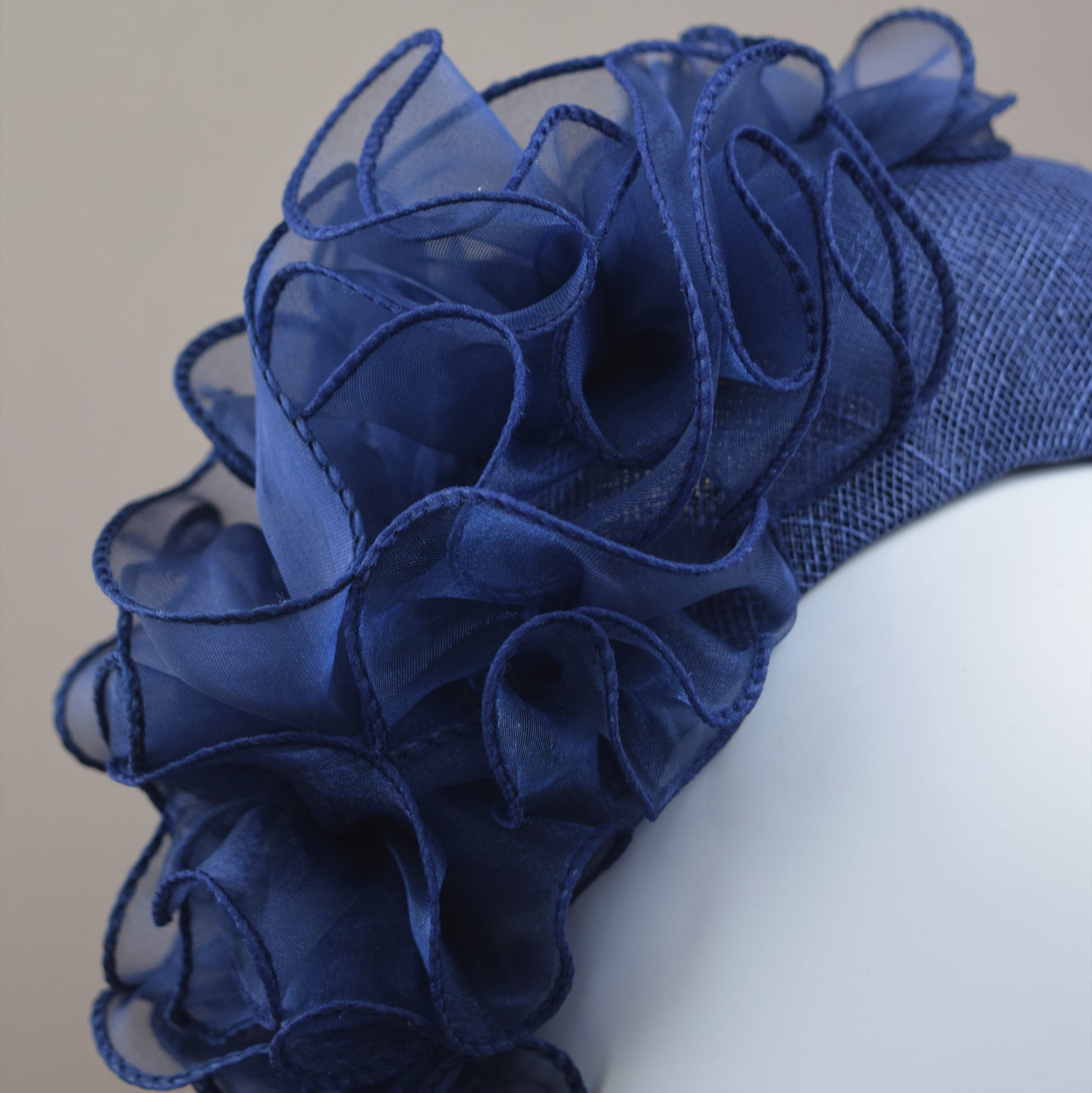 Formed from sinamay straw and embellished with ruffled organza.