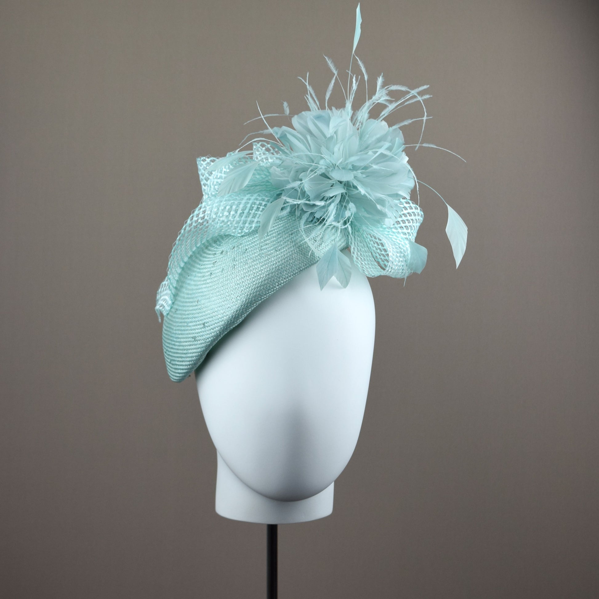 A unique one of a kind piece hand blocked and wired using traditional millinery skills. This lovely duchess style hat is formed from sisal straw. A handcrafted feather flower and diamond checkered mesh add height and texture to this lovely piece.