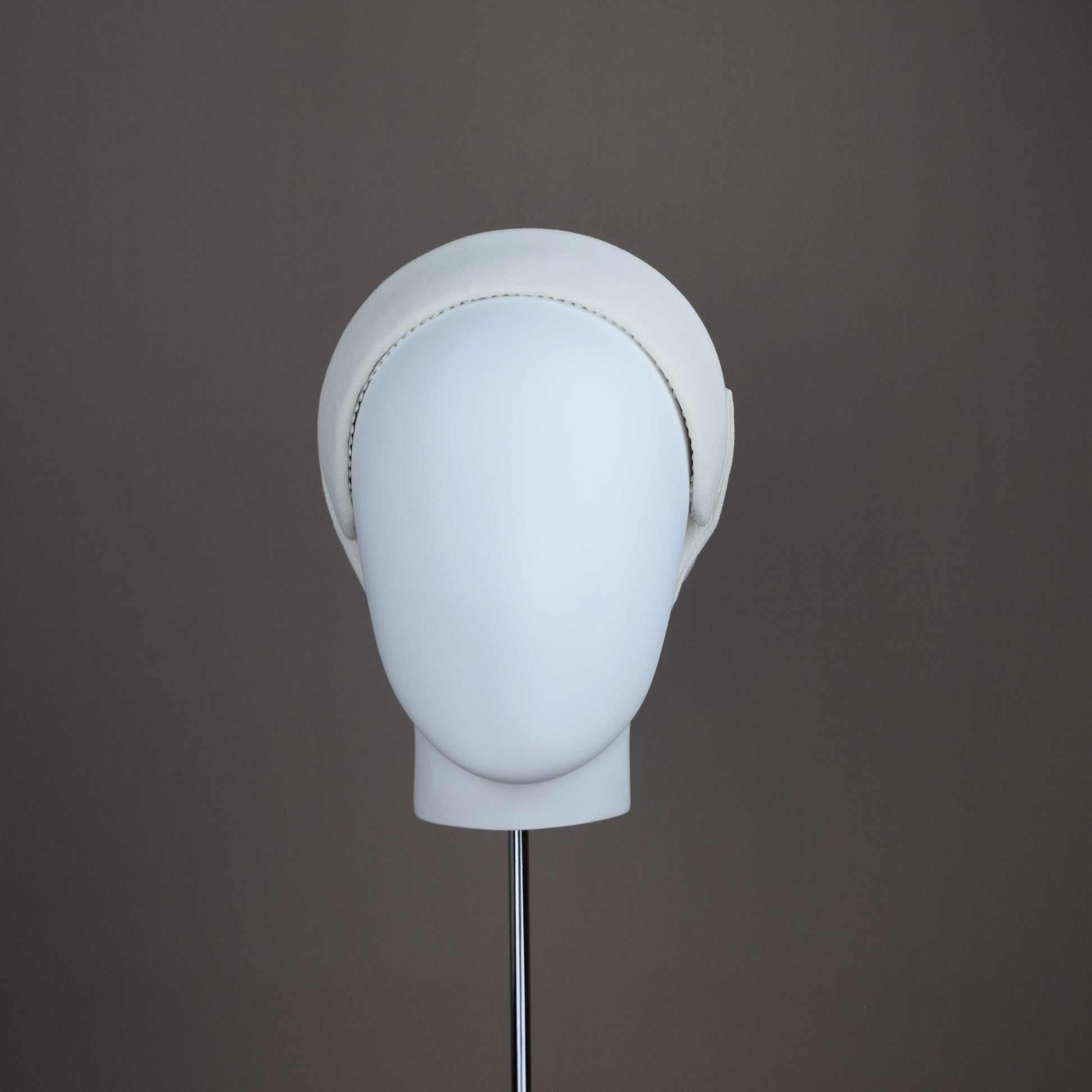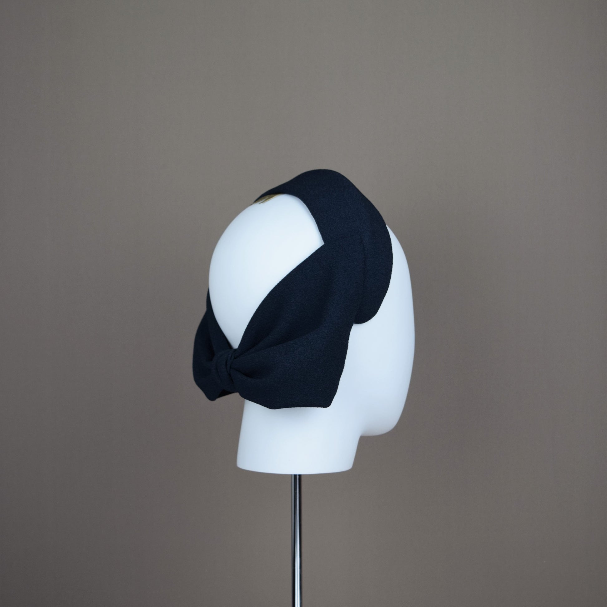 A trans-seasonal head piece hand blocked and wired using traditional millinery skills. This lovely headband has been covered in a crepe fabric and decorated with a large crepe bow.