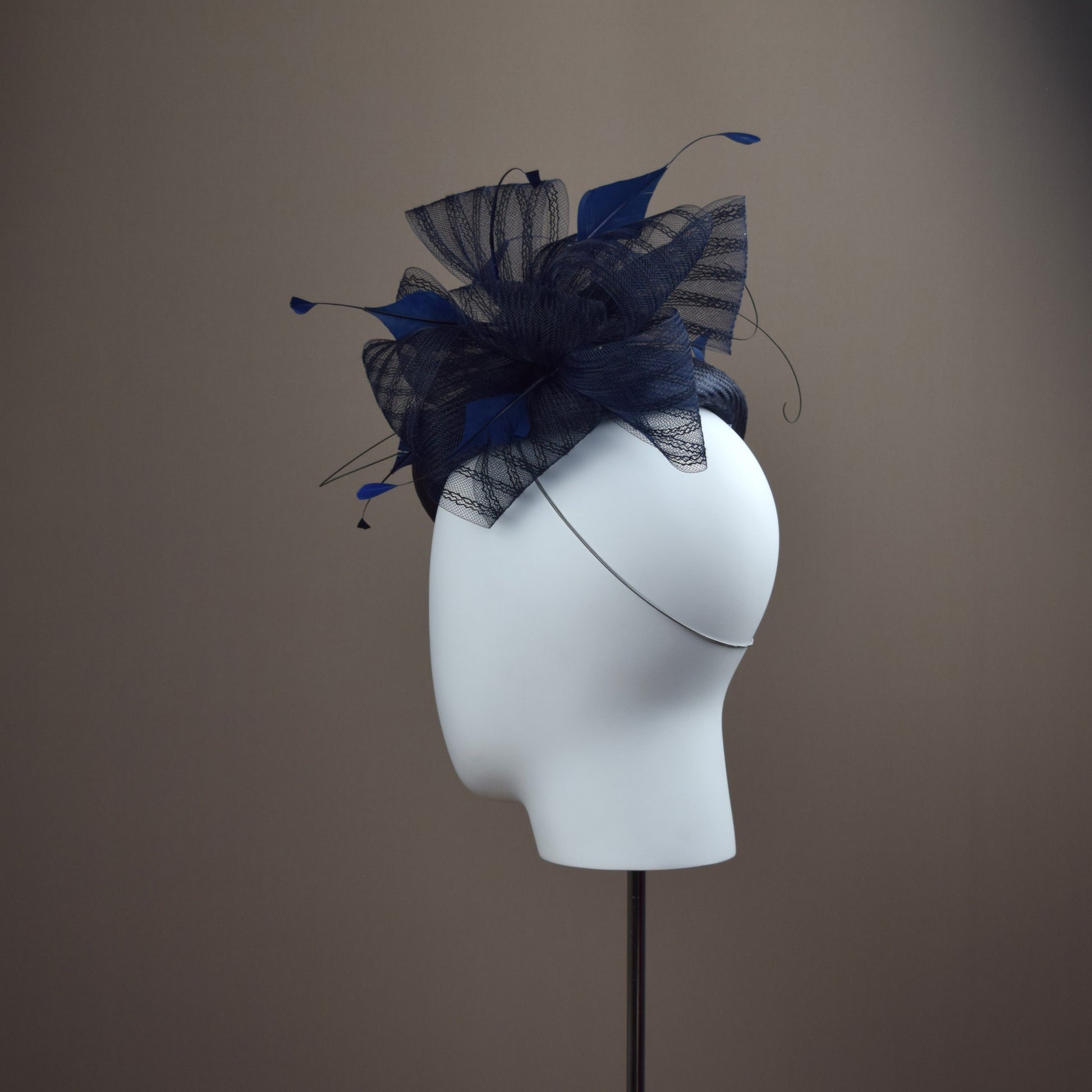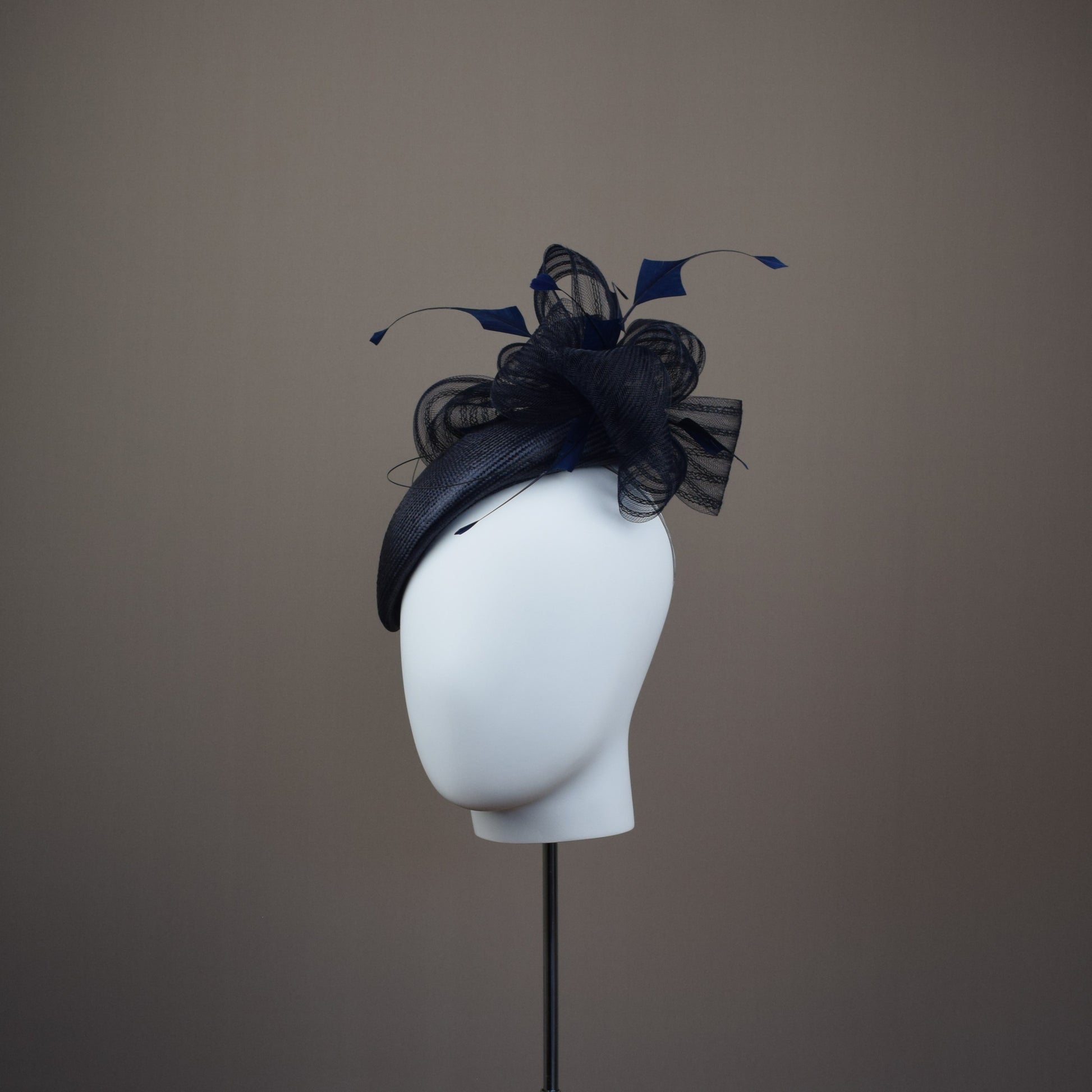 Hand blocked and wired using traditional millinery skills this lovely duchess style hat is formed from a dark navy sisal straw. Simply embellished with loops of embroidered mesh ribbon and spiky hand cut arrow feathers.
