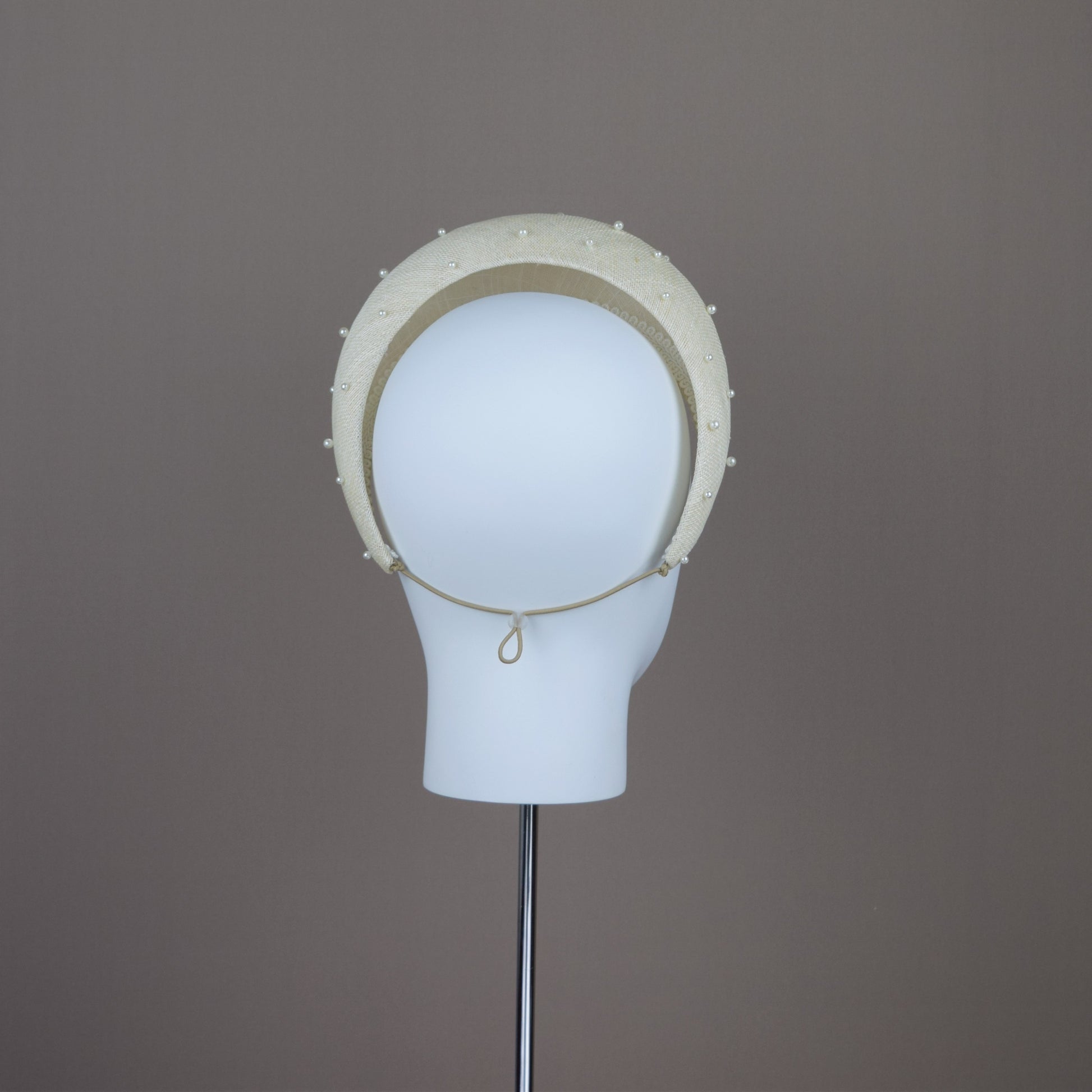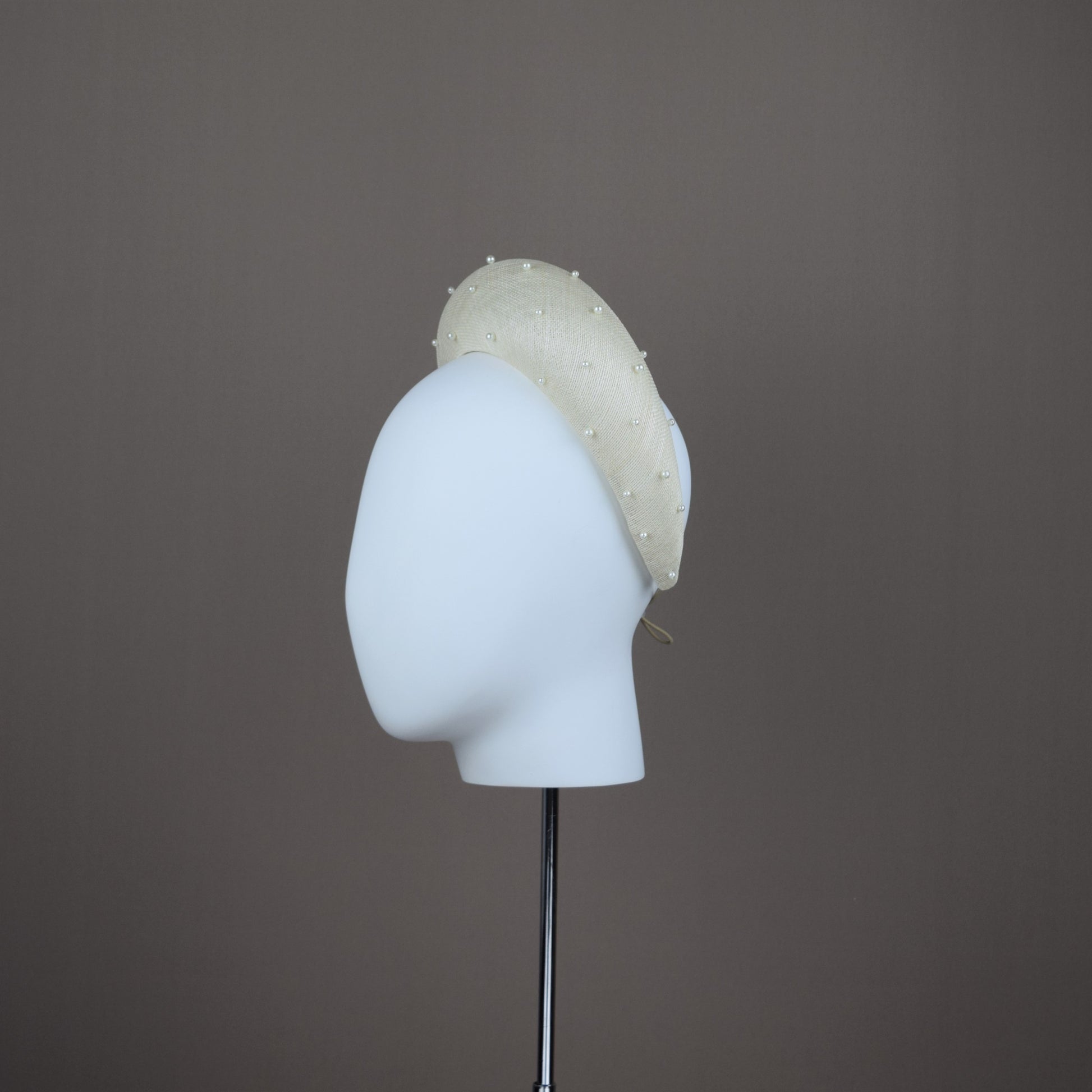 Formed from the finest quality sinamay straw in an ivory/cream shade and studded with hand sewn pearls.