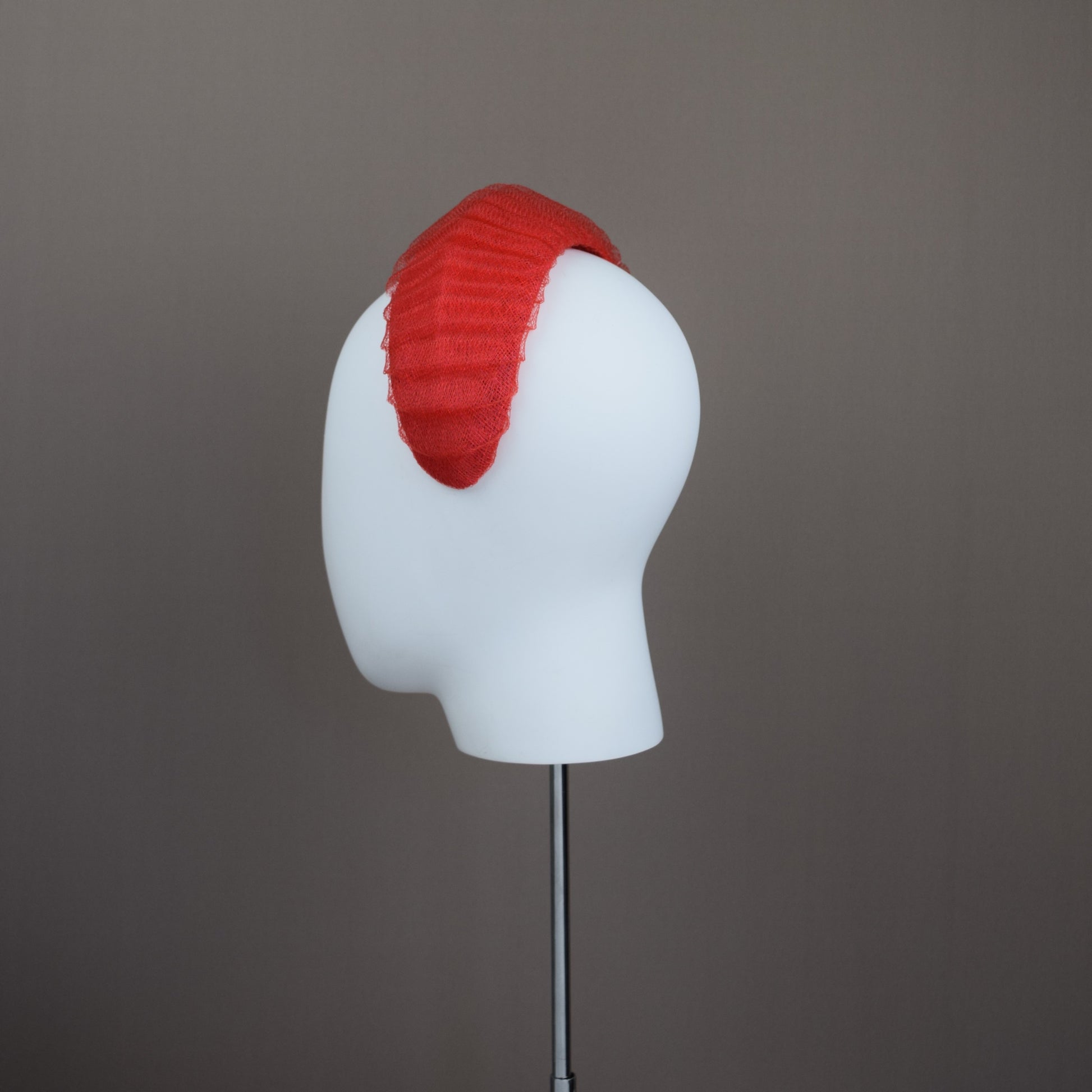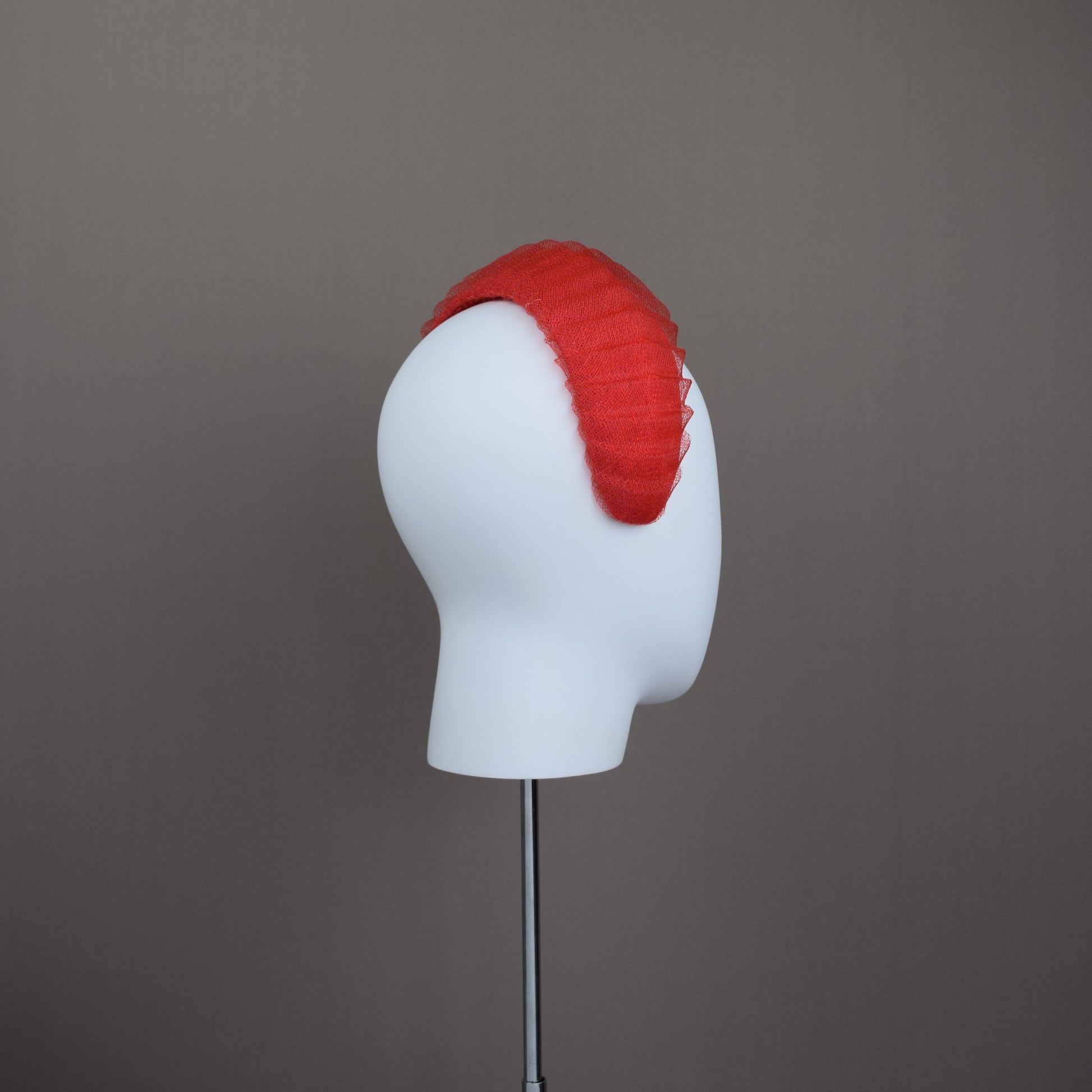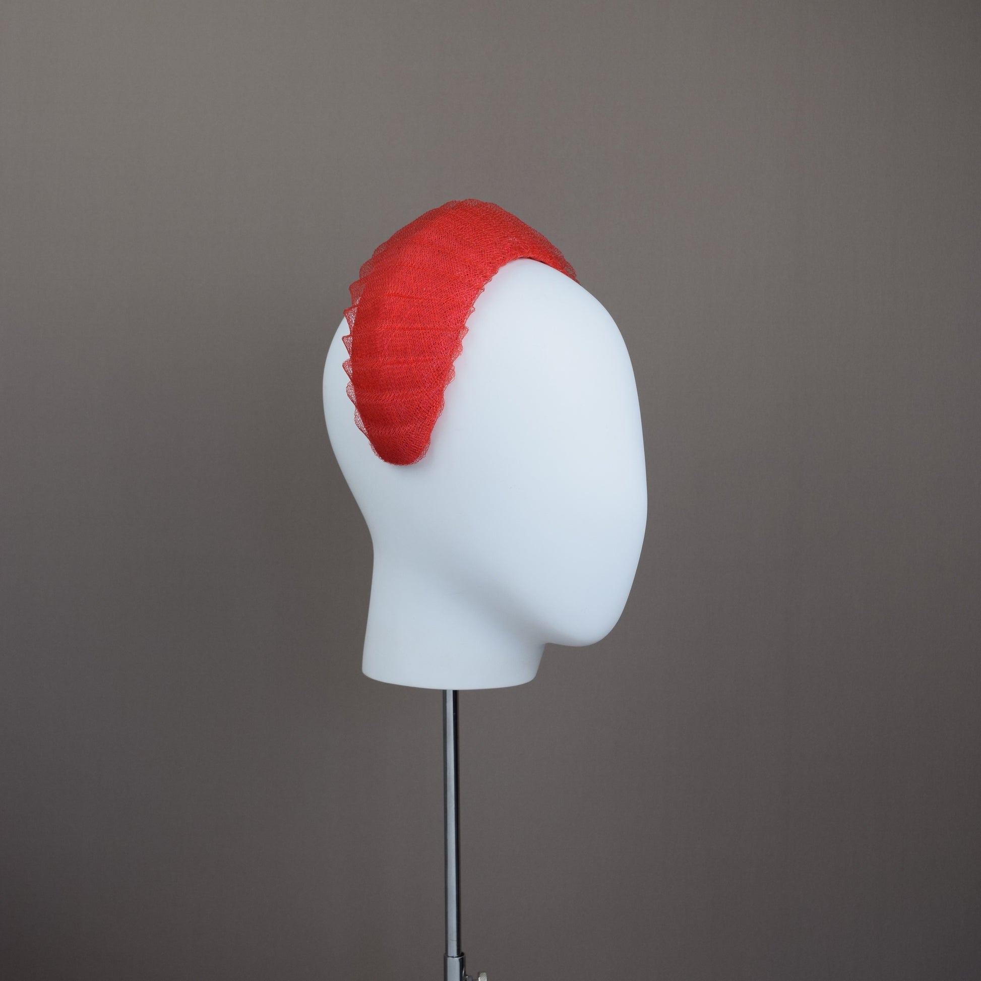 Simple but elegant this lovely ridged style headband has been hand blocked in sinamay straw and covered in a fine pleated mesh fabric.
