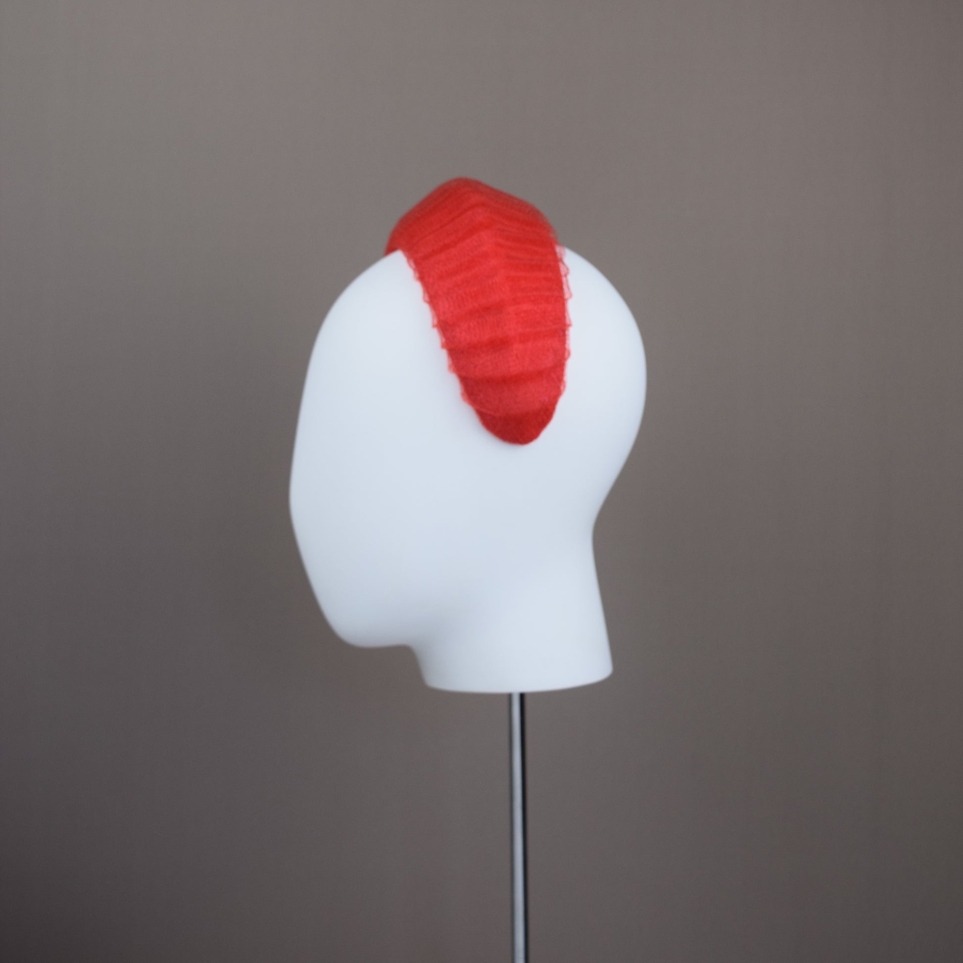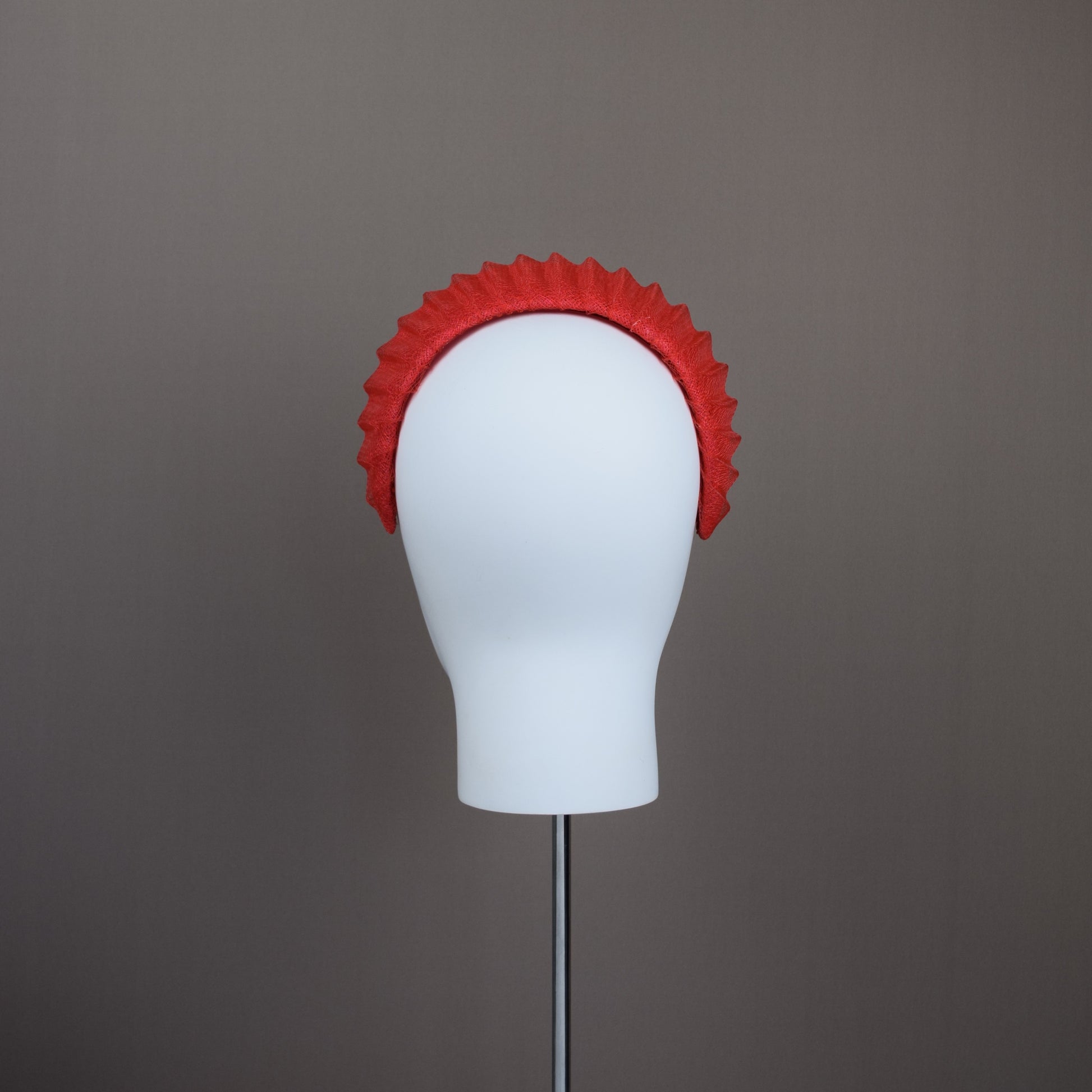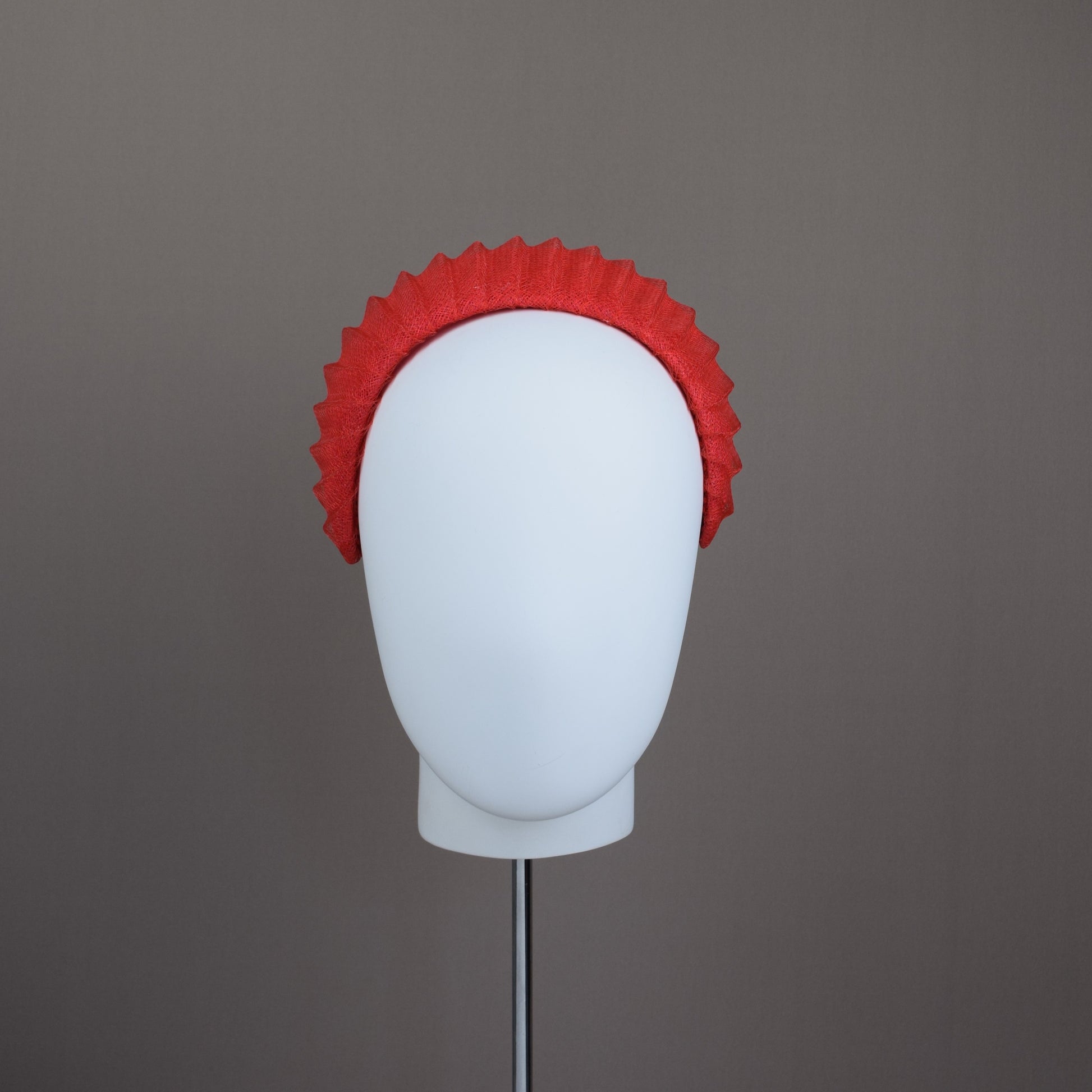 Simple but elegant this lovely ridged style headband has been hand blocked in sinamay straw and covered in a fine pleated mesh fabric.