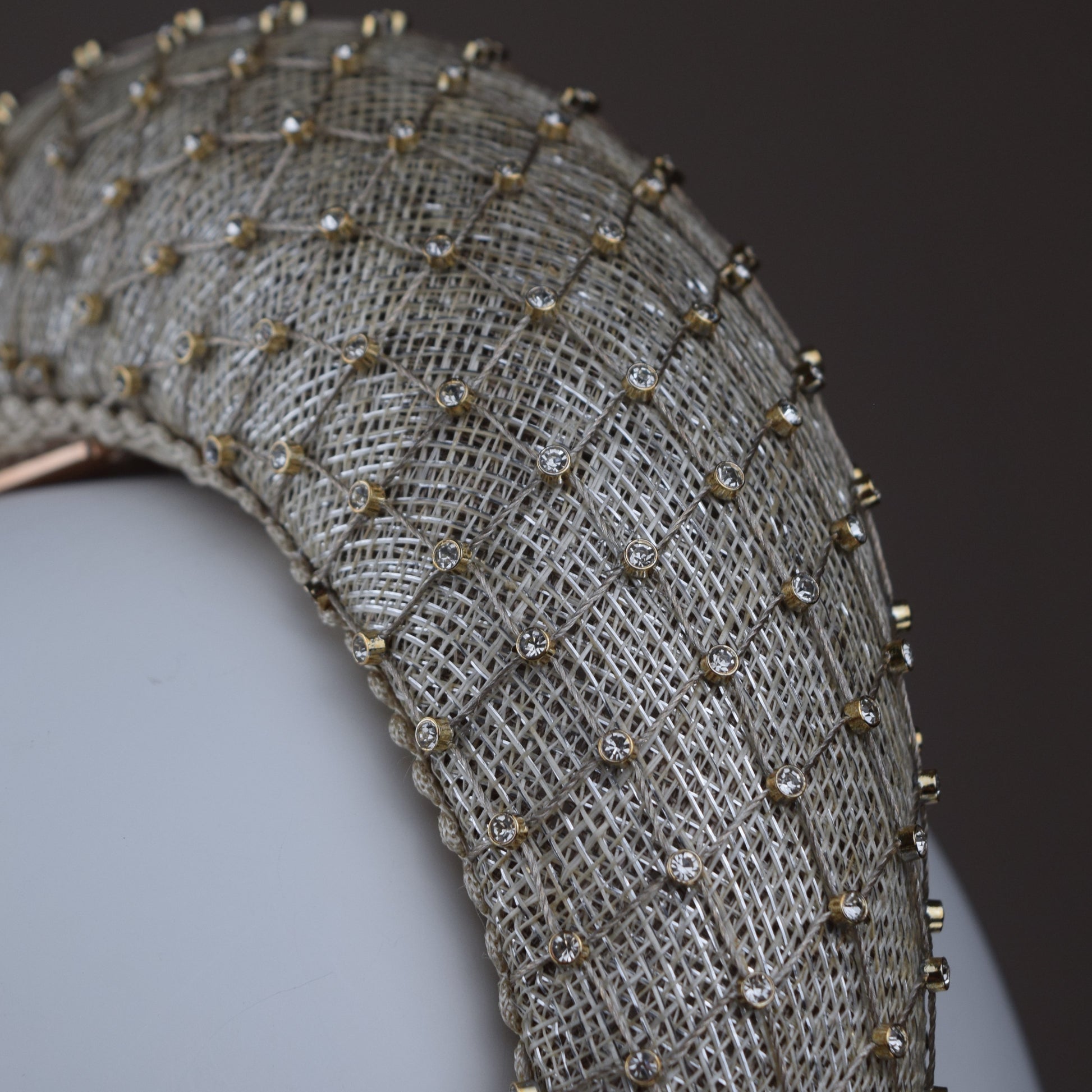 A stunning headband hand blocked using traditional millinery techniques. Formed from sinamay straw in a neutral colour with silver highlights and overlaid with a diamante crystal net. The overall effect is a white gold shade.